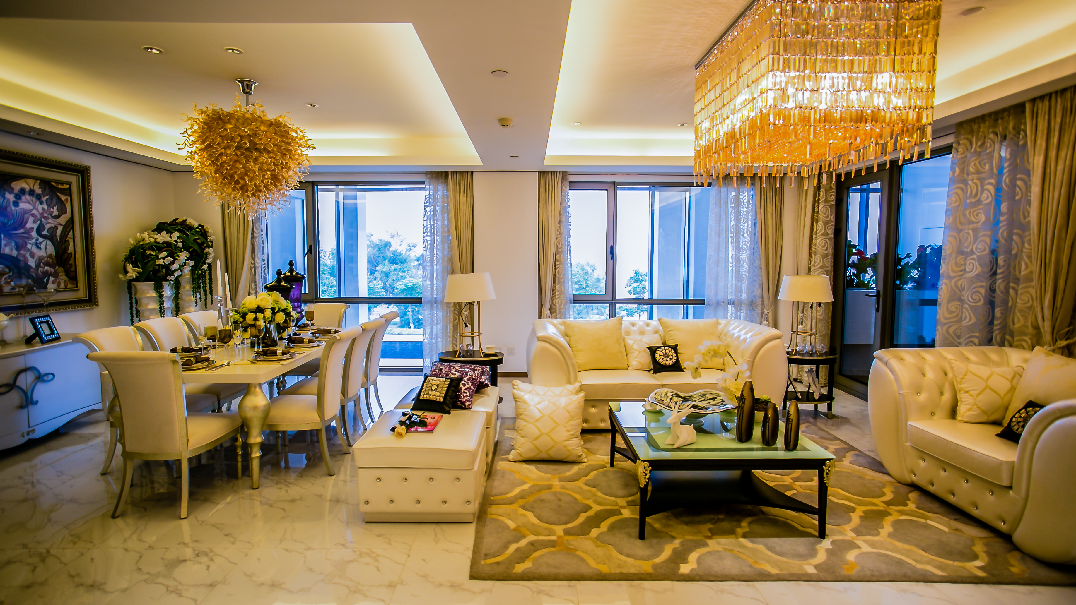沒(méi)有過(guò)多的裝飾,圓桌圓椅和多層圓形水晶吊燈相互輝映,呼應(yīng)“天圓地方”的說(shuō)法,體現(xiàn)業(yè)主天人合一的態(tài)思想度。落地百葉窗使整個(gè)環(huán)境更加寬敞明亮。餐桌與餐廳吊燈及墻上的裝飾畫(huà)相呼應(yīng),干枝花瓶的擺放充分體現(xiàn)中國(guó)傳統(tǒng)美學(xué)精神,注重細(xì)節(jié)的設(shè)計(jì)往往更能體現(xiàn)空間的品質(zhì),在住宅空間中同樣能達(dá)到“移步換景”的裝飾效果。