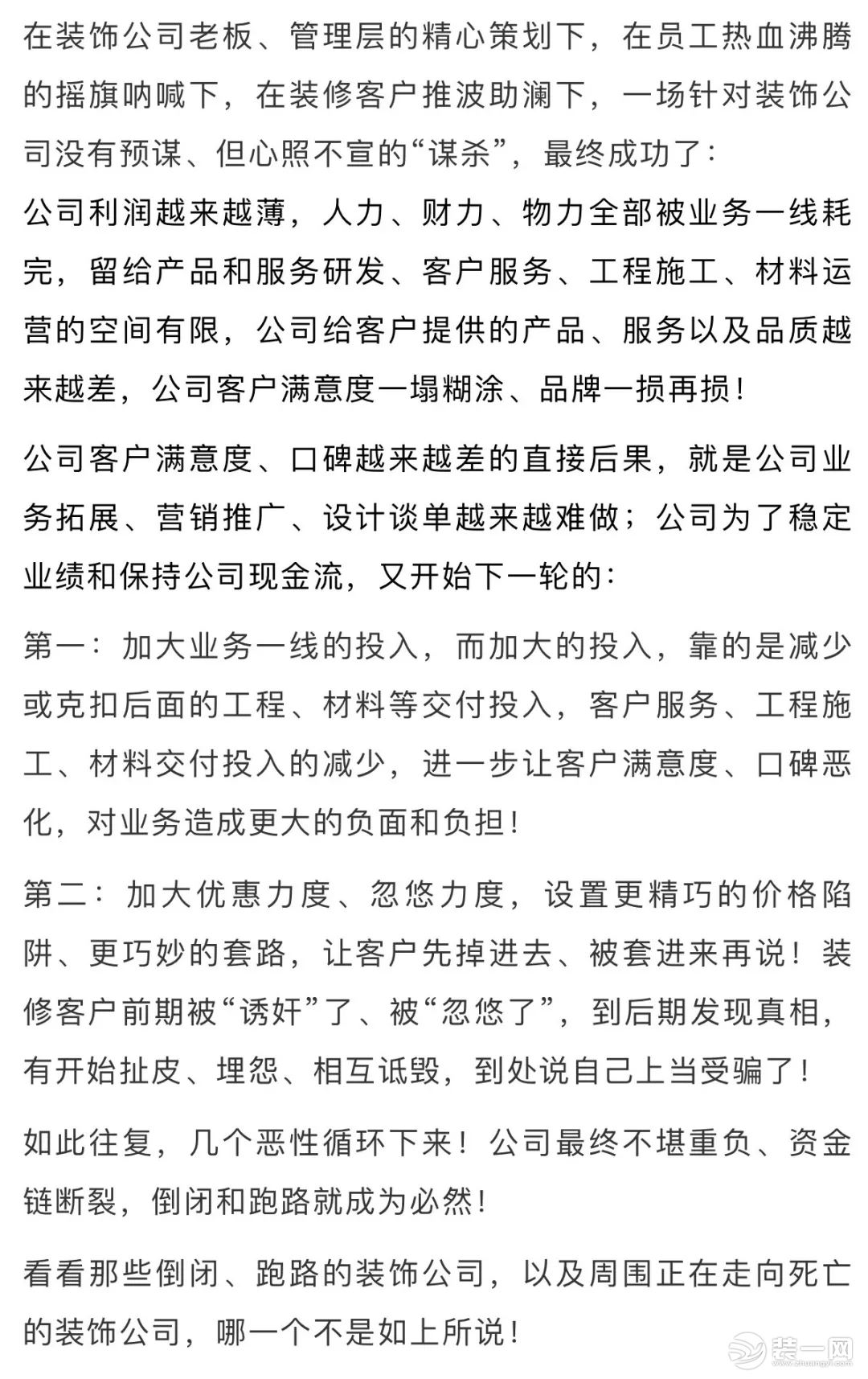 對(duì)于裝修行業(yè)出現(xiàn)的倒閉、跑路倒閉潮,喻老師對(duì)每一家倒閉的裝飾公司進(jìn)行跟蹤分析。最終,總結(jié)一條:過渡營(yíng)銷!